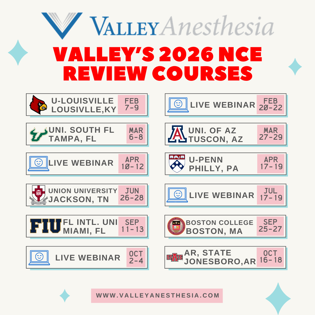 Since 1990 Valley has hosted our legendary live 3-day NCE review course for student nurse anesthetists, preparing them for their certification exams.